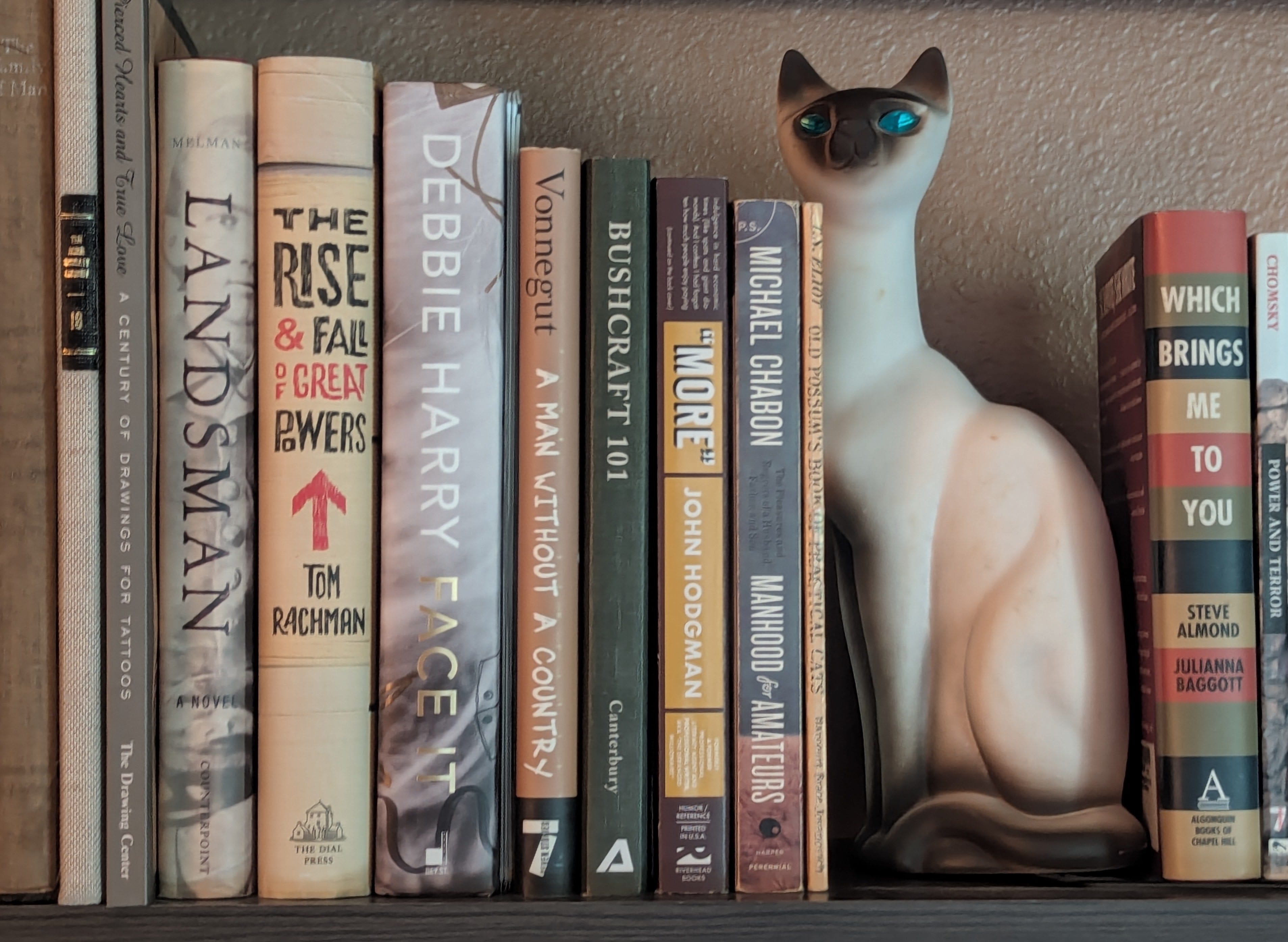 Today I caught sight of Tom Rachman’s second book, The Rise and Fall of Great Powers: tan-colored spine, black and red lettering, Debbie Harry and Peter Melman hugging him on either side.